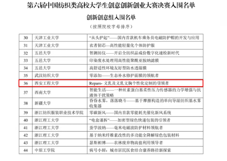 2023年5月6日,第六届中国纺织类高校大学生创意创新创业大赛于安徽工程大学成功举办。大赛共收到全国35所高校选送的168项参赛作品,经专家评审,评选出52个项目入围决赛。据悉,本次大赛是由教育部高等学校纺织类专业教学指导委员会、中国纺织服装教育学会、上海管理教育学会联合发起主办的全国性大赛,参赛队伍涵盖国内所有纺织类高等院校,代表纺织类专业创新创业比赛的最高水平。