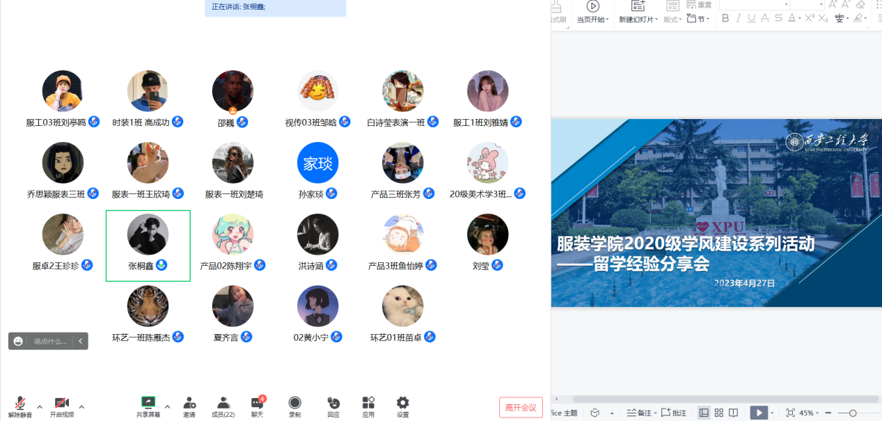 举办学风建设系列活动之出国留学经验分享会。2020届产品设计专业优秀毕业生张桐鑫为在校生做留学经验分享,搭建交流平台,辅导员邵巍与40多名有出国意向的同学参加了此次线上分享交流会。