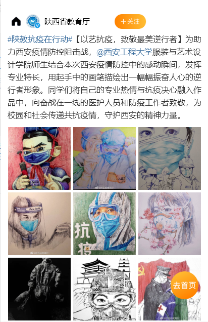 韩h漫 视觉传达系“以艺抗疫,最美逆行者”主题抗疫作品被陕西省教育厅微博客户端转载,全文如下: