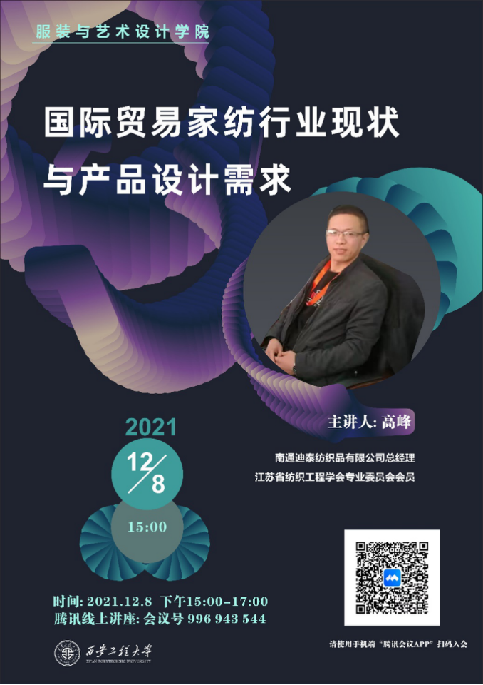 优秀校友、南通迪泰纺织品有限公司总经理、江苏省纺织工程学会专业委员会会员高峰老师为产品设计专业全体师生进行《国际贸易家纺行业现状与产品设计需求》的主题讲座,会议由产品设计系王燕老师主持,产品设计系教师及本科生九十余人参加会议。
