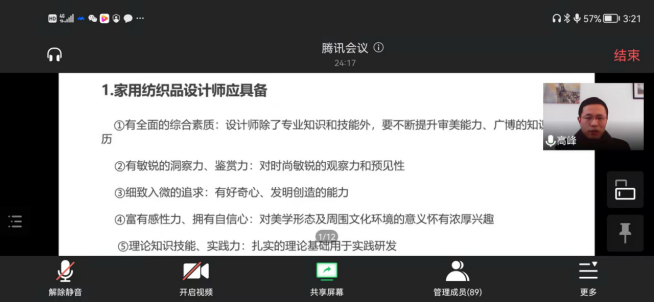 此次分享会高峰老师从家用纺织品行业运行分析、中国对外家纺贸易行业的挑战与机遇、家用纺织品专业人才素质及设计需求三个角度讲解,指出行业总体稳定向好,出口市场持续增长;中国外贸已进入新格局,对外贸易格局的稳定需要多方通力合作。作为家用纺织品设计师应具备全面的综合素质,扎实的理论基础用于实践研发,有对时尚敏锐的观察力和预见性,有好奇心、发明创造的能力,拥有自信心和感染力,对美学形态及周围文化环境的意义怀有浓厚的兴趣。