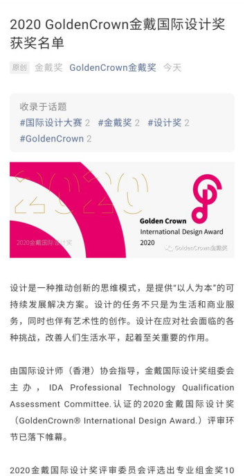 2021年5月5日,2020 GoldenCrown金戴国际设计奖落下帷幕,来自港澳台、亚太地区、全球范围的美术院校专业教师、设计专业学生、应届毕业生参加这次比赛,最终评选出专业组金奖10件,银奖15件,铜奖20件,提名奖37件;院校组金奖11件,银奖15件,铜奖23件,提名奖48件。韩h漫