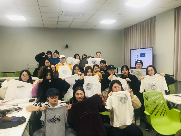 学生积极参与动手制作,制作过程中还与设计大学的老师展开了讨论,制作过程中同学们纷纷在线上展示自己设计的图型及个人创意设计,与俄方老师交流互动,制作完毕后同学们集体展示了个人设计的个性化T恤。