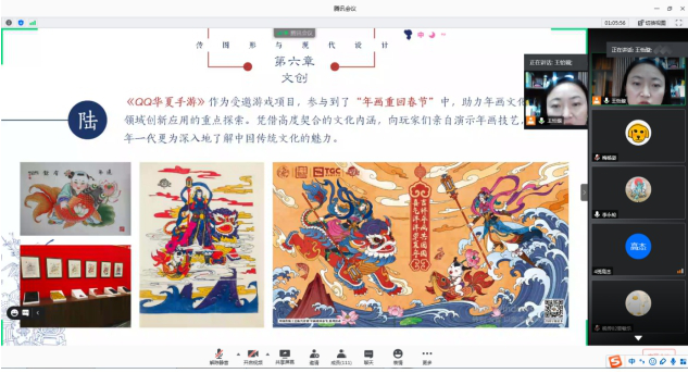 视觉传达系邀请陕西省工艺美术大师,国家非物质文化遗产项目·凤翔木板年画第二十一代传承人,陕西工艺美术学会理事,陕西新文艺青年协会理事王怡璇老师在线上利用腾讯会议平台为广大师生做题为《凤翔木板年画的传承与创新》专题讲座,视觉传达系120余名同学参加了专题讲座。王怡璇老师多年来一直致力于国家非物质文化遗产项目·凤翔木板年画的保护传承,并且在凤翔木板年画的当代设计创新中不断进行探索,力求用全新的设计语言诠释传统艺术文化。