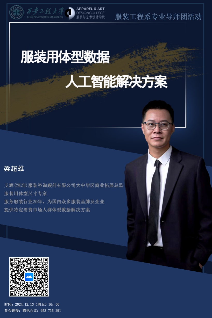 服装工程系于 12 月 13 日周五下午 16 时,在腾讯会议成功举办主题为《服装用体型数据人工智能解决方案》的专业导师团活动讲座。此次讲座荣幸邀请到艾辉(深圳)服装咨询顾问有限公司的梁超雄总监担任主讲嘉宾,由服装工程系齐静老师主持,服装工程系师生线上参加讲座。