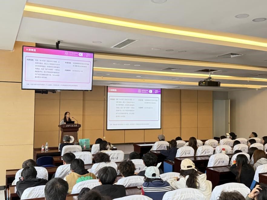 邵熹雯、刘蓉两位副教授详细介绍赛制、赛事流程、作品提交要求等。两位老师与在场师生就生成式AI辅助设计、数据训练、提示词优化等应用展开交流,鼓励学生积极参赛、勇于创新,跨界探索。