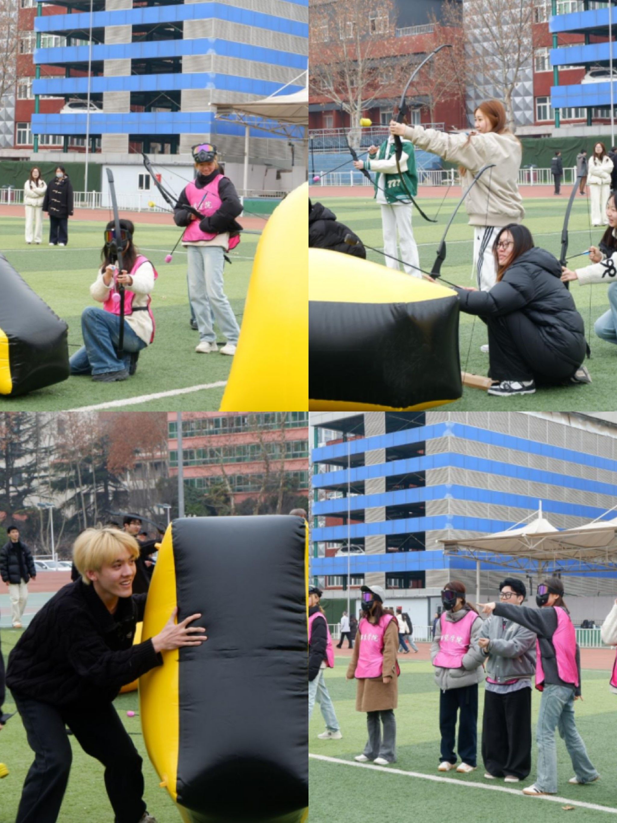 攻防交锋显智慧,体艺融合展风采。作为一项融合射箭技巧与战术策略的团队运动,攻防箭比赛既考验个人体能,更强调协作与谋略。赛场上,参赛队员身着护具,手持安全弓箭,灵活运用“避实击虚”“出奇制胜”等战术,在掩体间穿梭,展现了智慧与协作。马保雷作为赛事技术指导,全程为同学们提供专业支持。他提到:“攻防箭打破了传统体育活动的边界,学生在比赛中团结协作,不仅能提升身体素质,更能在实战中培养应变力和领导力,他们表现出的创意灵动与体育竞技的硬核热血碰撞出了独特火花。”