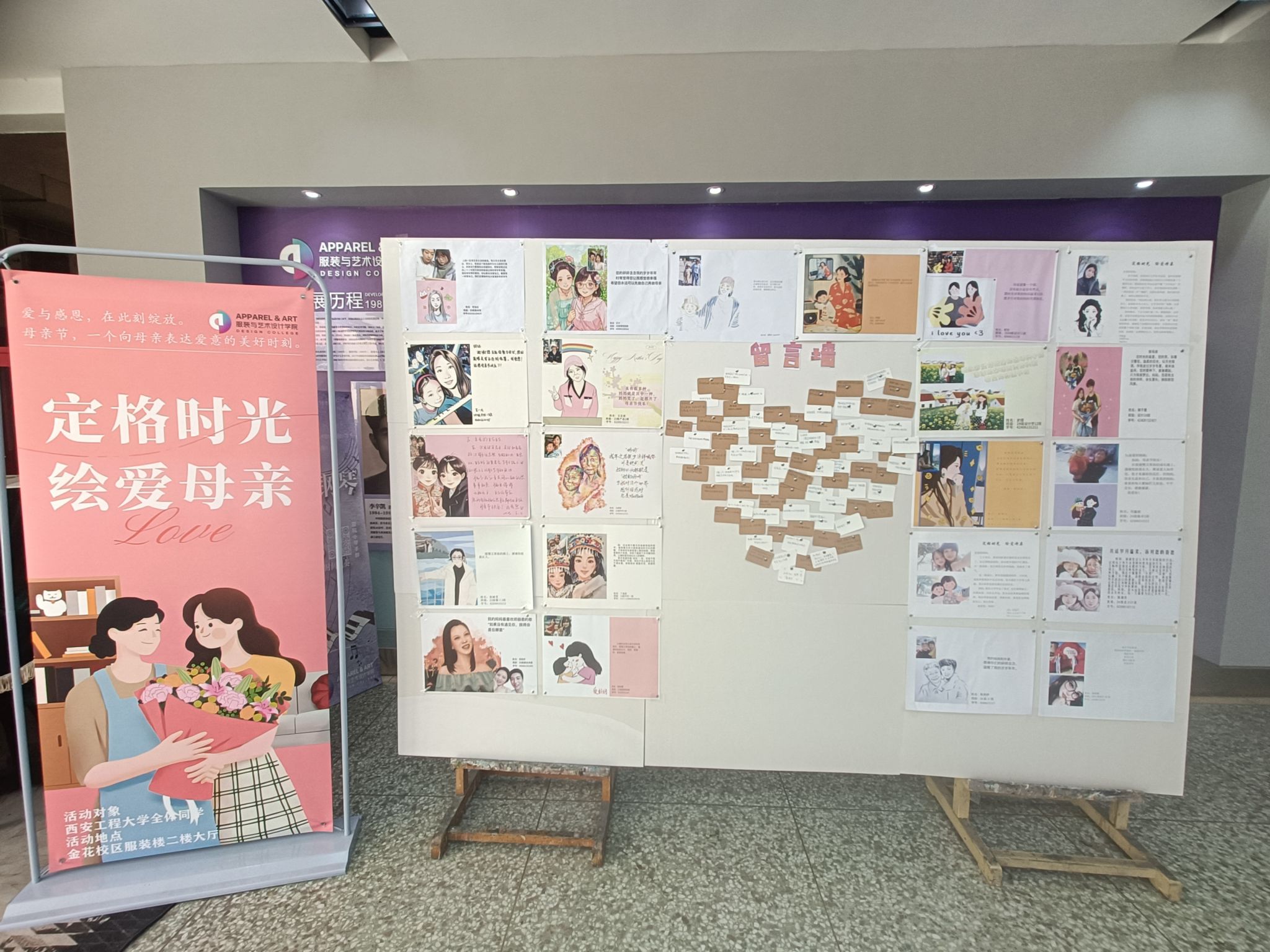 活动现场还特别设置了“爱的留言墙”,吸引众多同学们驻足书写祝福。一句句“妈妈,我爱您”“愿时光慢行,您永远年轻”的真挚话语,与展出的艺术作品交相辉映,凝聚成感恩的暖流。