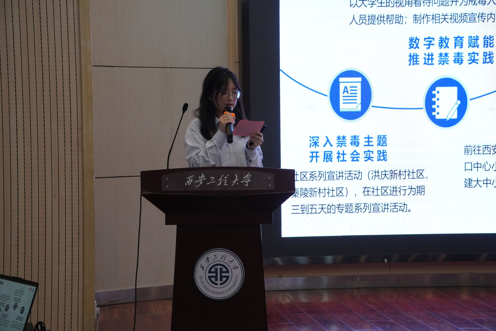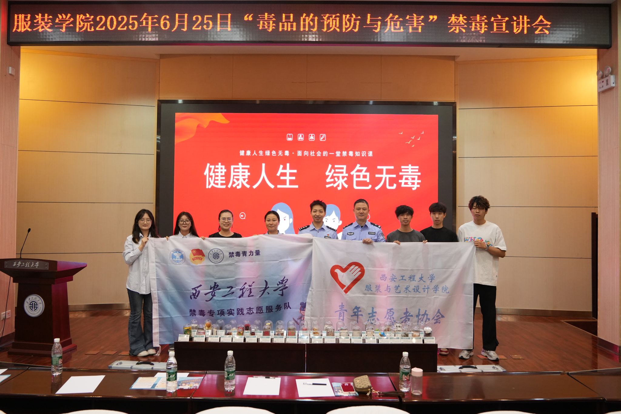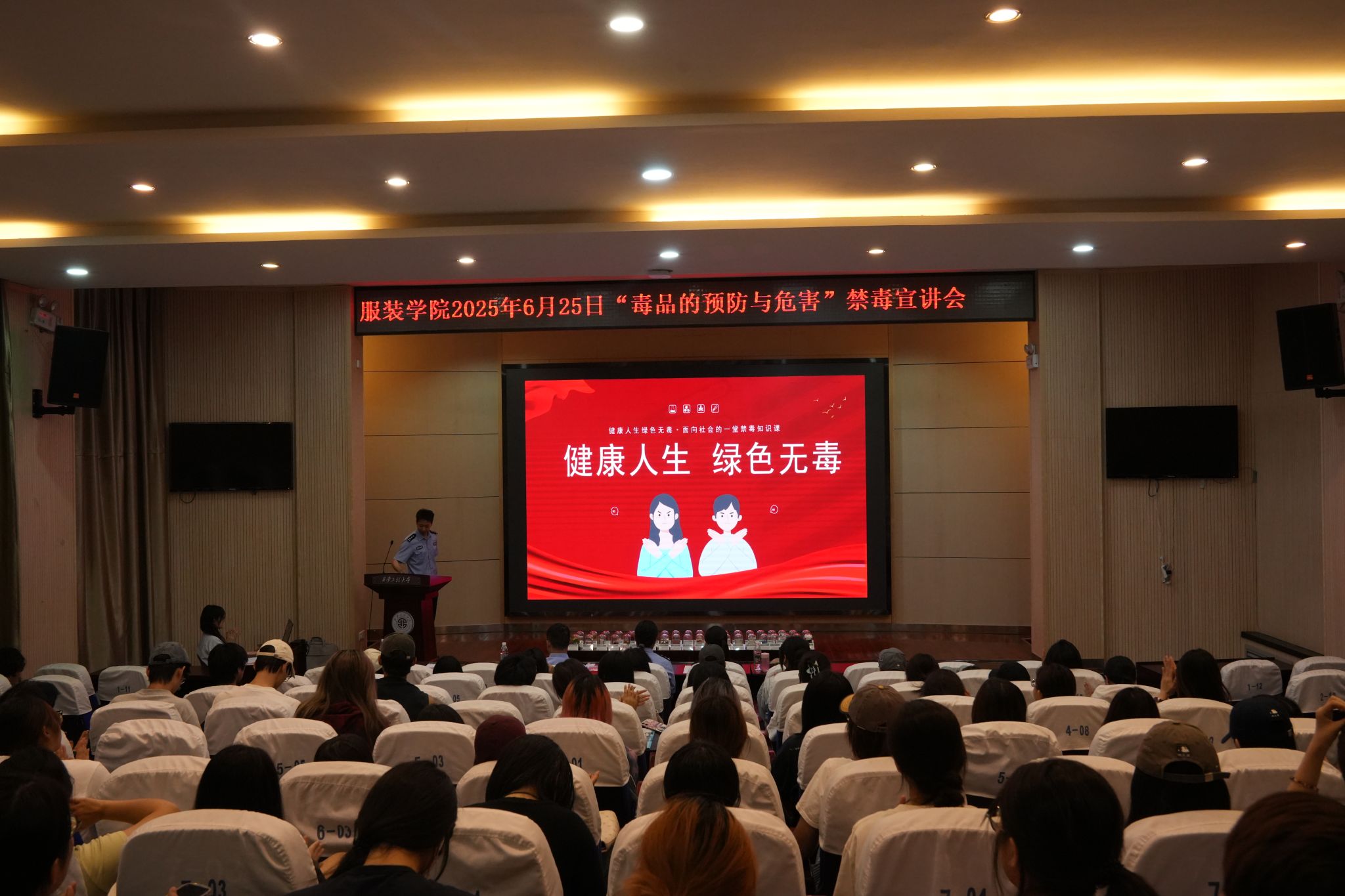 在第38个国际禁毒日来临之际,为进一步提升广大师生识毒、防毒、拒毒意识和能力,6月25日下午,首场系列活动——“健康人生,绿色无毒”专题宣讲会在金花校区西纺报告厅成功举办。西安市碑林区禁毒大队教育宣传一级警长高歌、碑林区禁毒委员会办公室毒品危害与防治专职讲师王豪、韩杰及韩h漫