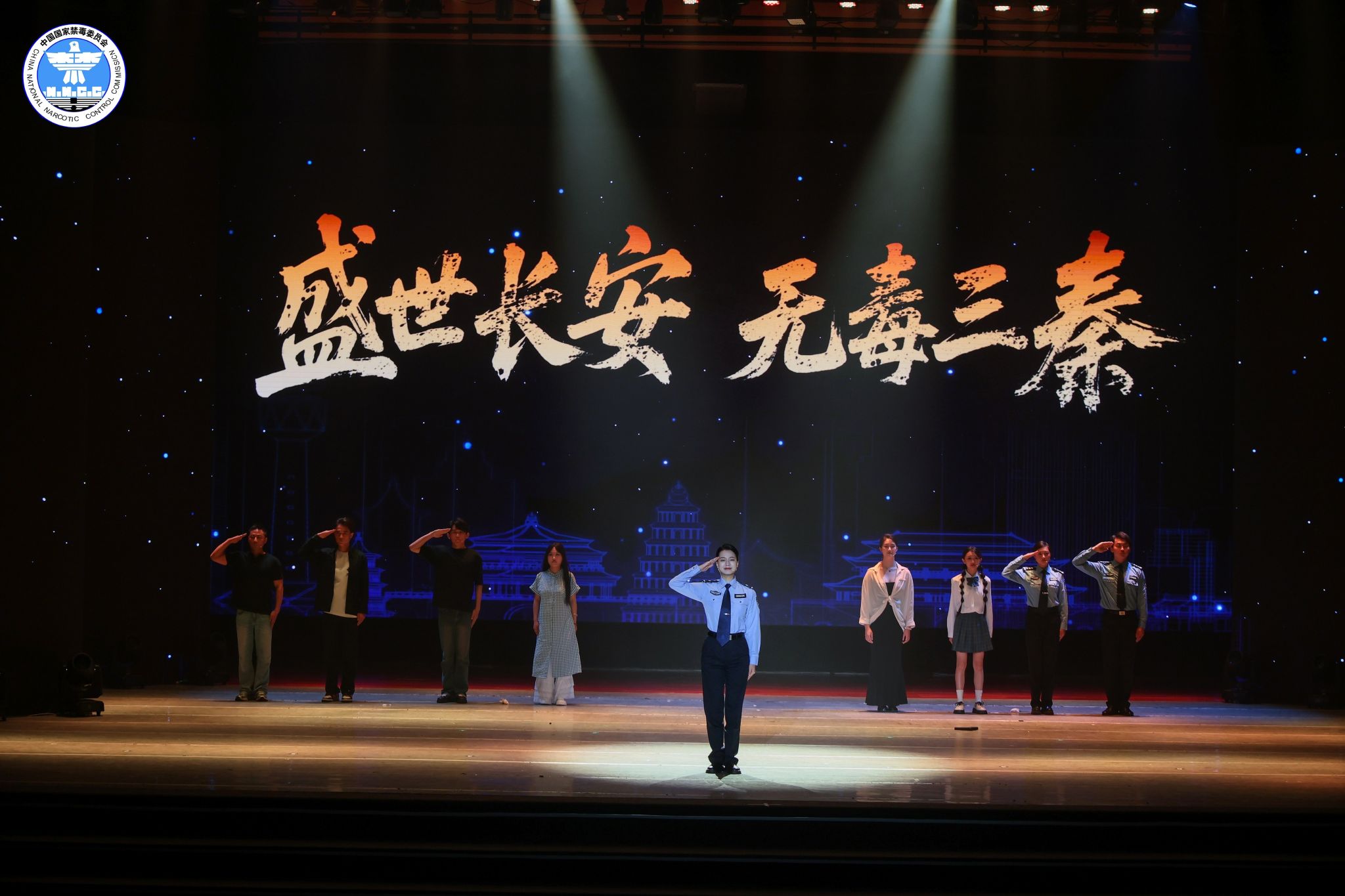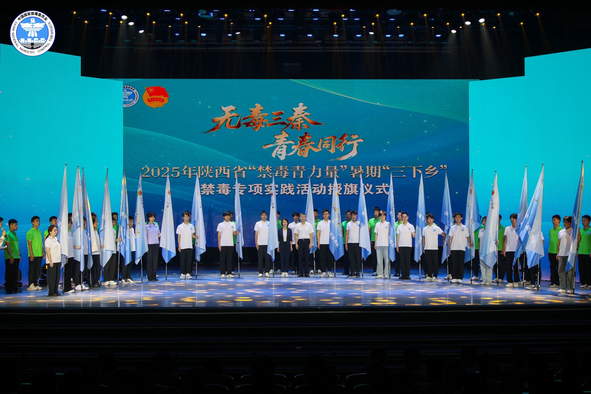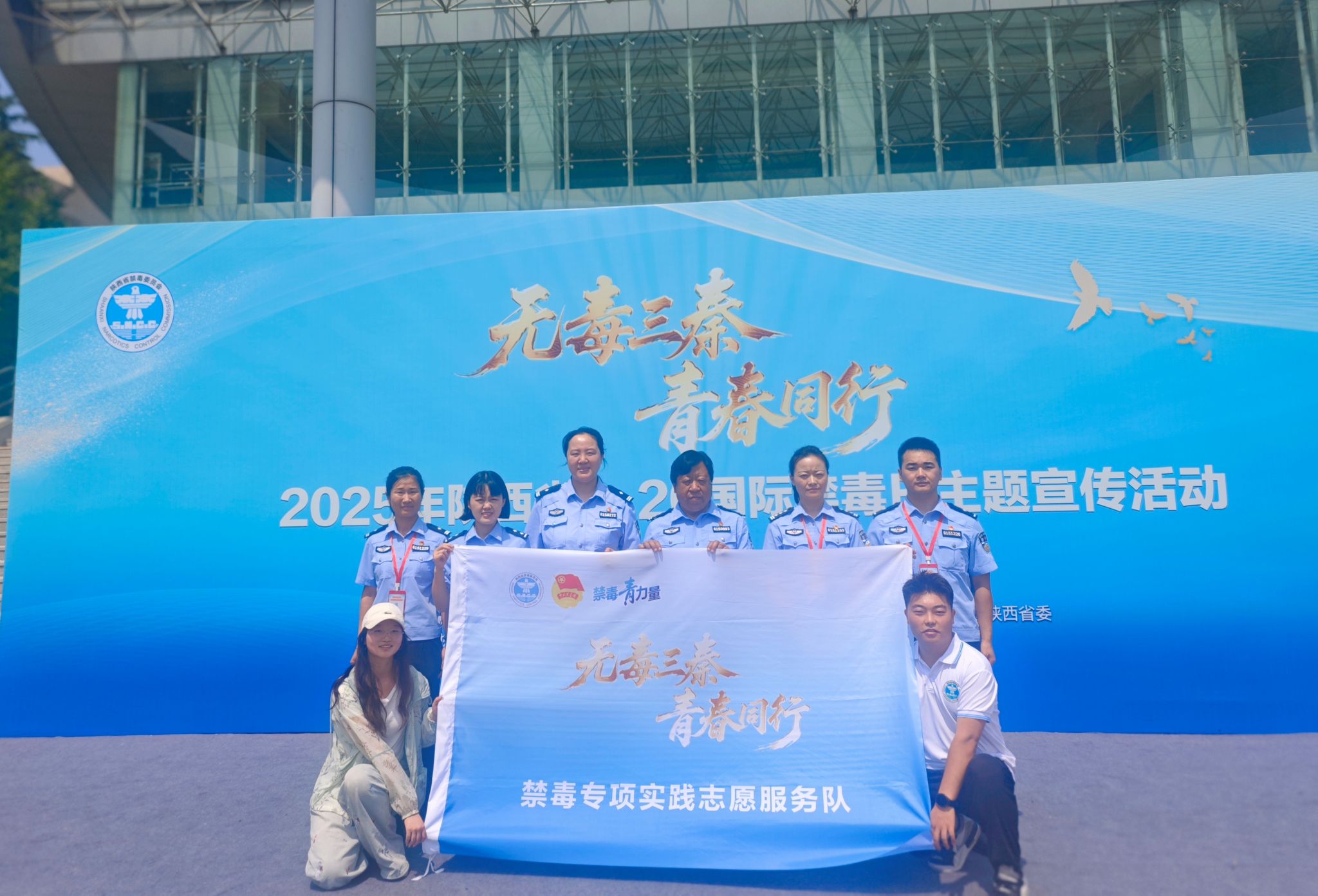 “‘毒’行睘睘”实践队学生代表前往陕西师范大学,参加了由陕西省禁毒委员会等单位联合主办的 “无毒三秦、青春同行”2025年陕西省6.26国际禁毒日主题宣传活动。活动采用了沉浸式体验的形式,通过《守护长安》光影剧、《破碎的方程式》情景剧等新颖别致的艺术表演,生动深刻地传递了珍爱生命、远离毒品的理念。现场举行了庄严的禁毒志愿服务队授旗仪式,标志着全省大学生暑期“三下乡”禁毒宣传实践活动正式拉开帷幕。活动最后,全体参会师生合影留念。