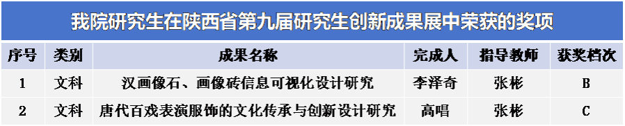 近日,陕西省教育厅、省学位委员会公布了陕西省第九届研究生创新成果展奖项评选结果,经学校申报、形式审查、专家评议与会议审议,韩h漫 硕士研究生李泽奇成果《汉画像石、画像砖信息可视化设计研究》荣获B档奖项、硕士研究生高唱成果《唐代百戏表演服饰的文化传承与创新设计研究》荣获C档奖项,指导教师为张彬教授。